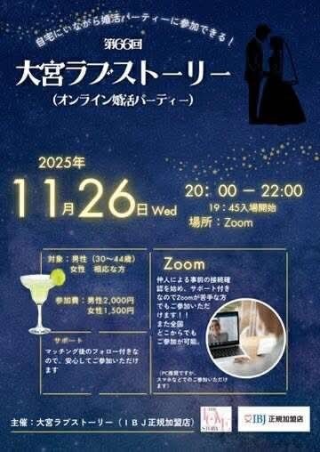 2025/11/26(水) 30歳~44歳くらいの男性と、そのくらいの男性との出会いを望む女性のオンライン婚活パーティー大募集です‼